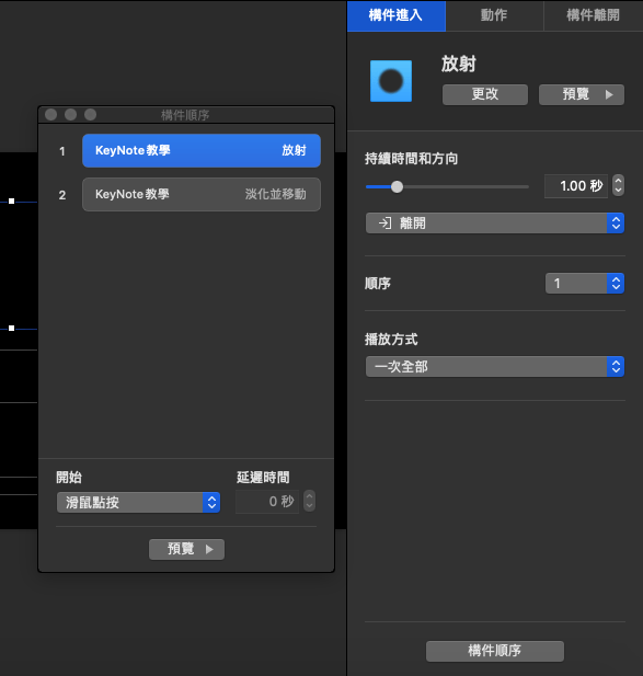| 動畫效果分成「構件進入」、「動作」、「構件進入」。 此為動畫效果選項與「構件順序」視窗之截圖 |